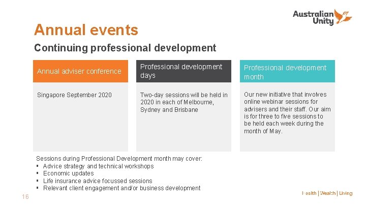 Annual events Continuing professional development Annual adviser conference Singapore September 2020 Professional development days Professional development month Two-day sessions will be held in 2020 in each of Melbourne, Sydney and Brisbane Our new initiative that involves online webinar sessions for advisers and their staff. Our aim is for three to five sessions to be held each week during the month of May. Sessions during Professional Development month may cover: § Advice strategy and technical workshops § Economic updates § Life insurance advice focussed sessions § Relevant client engagement and/or business development 16