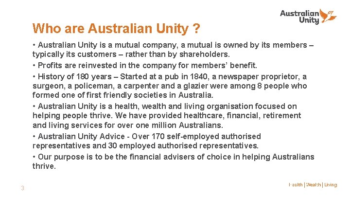 Disclaimer Important information Australian Unity Personal Financial Services Ltd (‘AUPFS’) ABN 26 098 725 145, AFSL & Australian Credit Licence 234459. AUPFS is a wholly owned subsidiary of Australian Unity Limited. Information in this document is provided on a confidential basis. It is summarised information intended solely for the purposes of evaluating AUPFS for the purposes of reviewing as a Licensee provider. This information is not intended for any other audience or recipient, and as it is disclosed on a confidential basis. No permission is granted (or implied to be granted), for subsequent publication or dissemination of this information to other parties or for any other purpose. Any advice on this presentation is general only and does not take into account the objectives, financial situation or needs of any particular person. All endeavours have been made to ensure that the information is accurate, and except where otherwise noted the information is current at June 2019. © 2019 Property of the Australian Unity Group, all rights reserved. Not to be reproduced or circulated to any other person without permission. 2