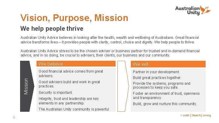 Vision, Purpose, Mission We help people thrive Australian Unity Advice believes in looking after the health, wealth and wellbeing of Australians. Great financial advice transforms lives – it provides people with clarity, control, choice and dignity. We help people to thrive. We believe We will Good financial advice comes from great advisers. Partner in your development. Good advisers build and work in great practices. Security is important. Integrity, trust and leadership are key elements in any partnership. The Australian Unity community is powerful. 6 Mission Australian Unity Advice strives to be the chosen adviser or business partner for trusted and in-demand financial advice, and in so doing, be crucial to advisers, their clients, our business and our community. Build great practices together. Provide the systems, programs and processes to keep you safe. Foster an environment of trust, openness and transparency. Build, grow and nurture this community.