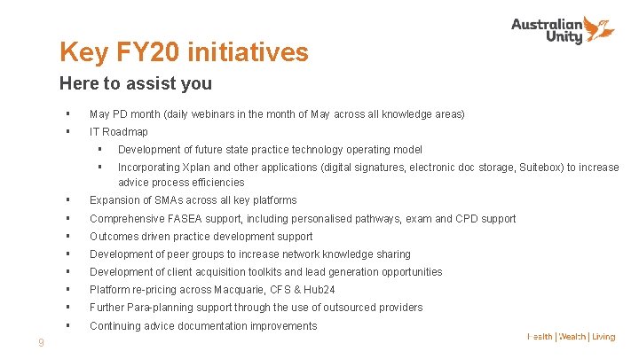 Personal Financial Services The Australian Unity difference Our values, community standing and mutual structure Exclusive adviser community and quality peer group Access to experts, senior leaders & reliable services A simple approach to helping you build your asset Advisers and their clients are at the heart of everything we do. Boutique in size. Genuine partnership built on trust and personal relationships. Focussed on client growth, efficiencies and risk management. Flat structure with direct access to more experienced staff. Lead generation, client acquisition & comms. Mutual parent, strong brand, secure, durable, longevity. Balance between freedom to operate and a well-capitalised parent when needed. 8 Strong focus on keeping each other safe with a cap on numbers. Access to other areas of the Australian Unity Group if desired. Practice development experts. Investment flexibility Compliance partnership.