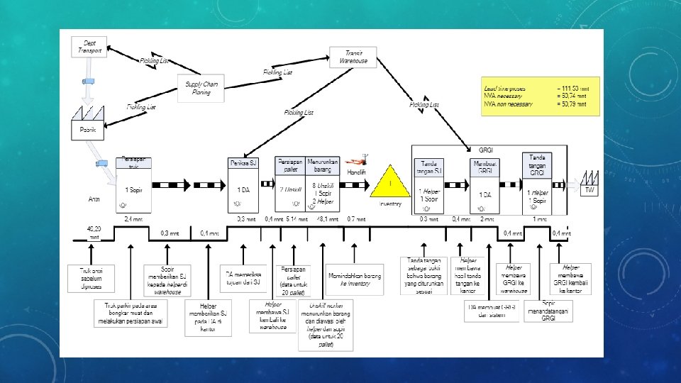 Proses Aktivitas Pekerja yang Bertugas Truk antri Persiapan truk Sopir Surat jalan (SJ) ke warehouse SJ diserahkan ke helper oleh sopir Surat jalan (SJ) ke kantor SJ diserahkan ke Distribution Assistance (DA) oleh helper Periksa surat jalan (SJ) Surat jalan (SJ) kembali ke warehouse DA Helper Persiapan pallet 2 unskill worker (berganitian) Menurunkan barang 8 unskill worker menurunkan barang, 2 helper dan seorang sopir mengawasi Memindahkan barang ke invetory Seorang unskill worker GRGI Tanda tangan surat jalan Sopir namun dibantu helper Hasil tanda tangan ke kantor Hasil tanda tangan diserahkan ke DA oleh helper Membuat GRGI ke warehouse DA Helper Tanda tangan GRGI Sopir namun dibantu helper GRGI ke kantor Helper