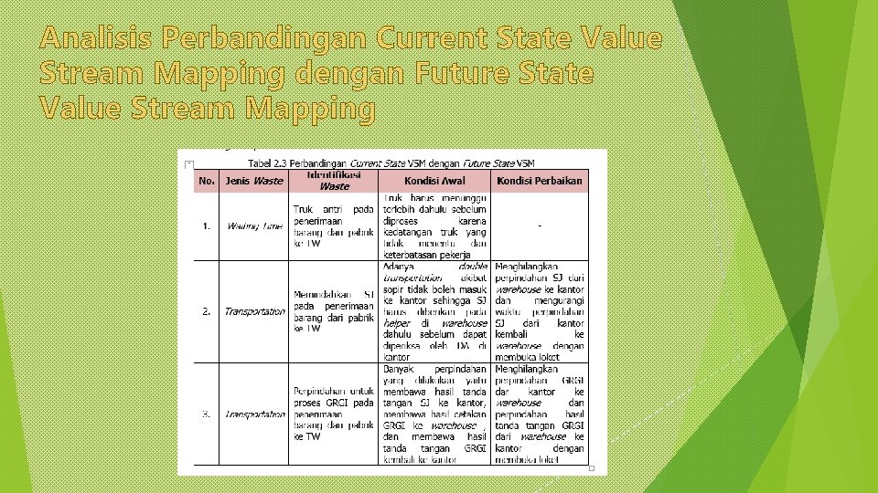 • Memindahkan SJ pada penerimaan barang dari pabrik ke TW Perbaikan yang dilakukan adalah dengan menambah loket pada kantor sehingga dapat mepermudah alur atministrasi sekaligus dapat memperpendek jarak perpindahan yang terjadi (petugas tidak perlu masuk kantor). Penerapan perbaikan ini menyebabkan proses perpindahan SJ hanya diperlukan sekali yaitu langsung dari sopir ke loket agar dapt diperiksa DA setelah itu sopir dapat langsung memberikannya ke helper di warehouse. Keuntungan penerapan perbaikan ini adalah dapat menghilangkan double transportation yang terjadi dan juga mengurangi jarak perpindahan sehingga lead time dapat berkurang.