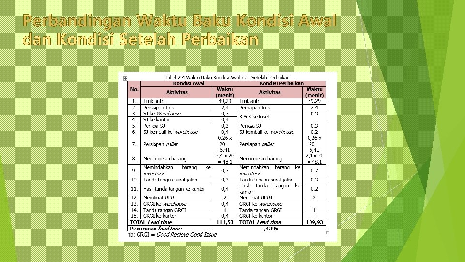 Perpindahan untuk proses GRGI pada penerimaan barang dari pabrik ke TW • Perbaikan yang dilakukan adalah dengan menambah loket pada kantor sehingga dapat mempermudah alur administrasi sekaligus dapat memperpendek jarak perpindahan yang terjadi (petugas tidak perlu masuk kantor). Penerapan perbaikan ini menyebabkan proses perpindahan diperlukan sekali saja yaitu helper memberikan hasil tanda tangan Sj ke DA melalui loket