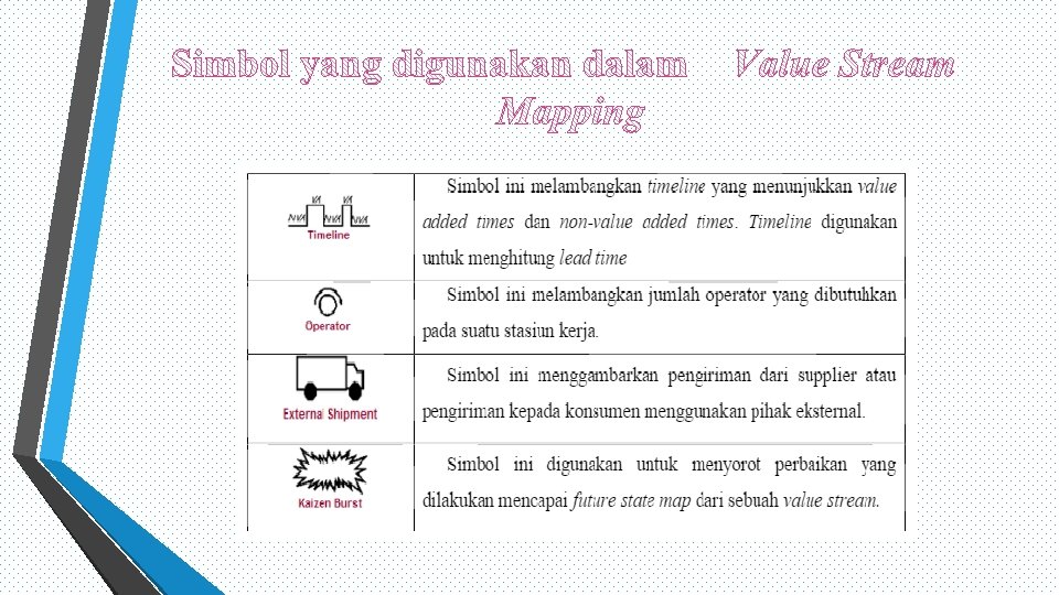 Pengertian Value Stream Mapping Value stream adalah seluruh kegiatan (baik yang value added maupun non-value added) yang diperlukan untuk memproses sebuah produk melalui dua aliran utama, yaitu: (1) aliran produksi dari bahan baku ke pelanggan dan (2) rancangan aliran dari konsep ke implementasi Value Stream Mapping adalah suatu metode pemetaan untuk memetakan aliran nilai (value stream) secara mendetail untuk mengidentifikasi adanya pemborosan dan menemukan penyebab-penyebab terjadinya pemborosan serta memberikan cara yang tepat untuk menghilangkannya atau paling tidak menguranginya