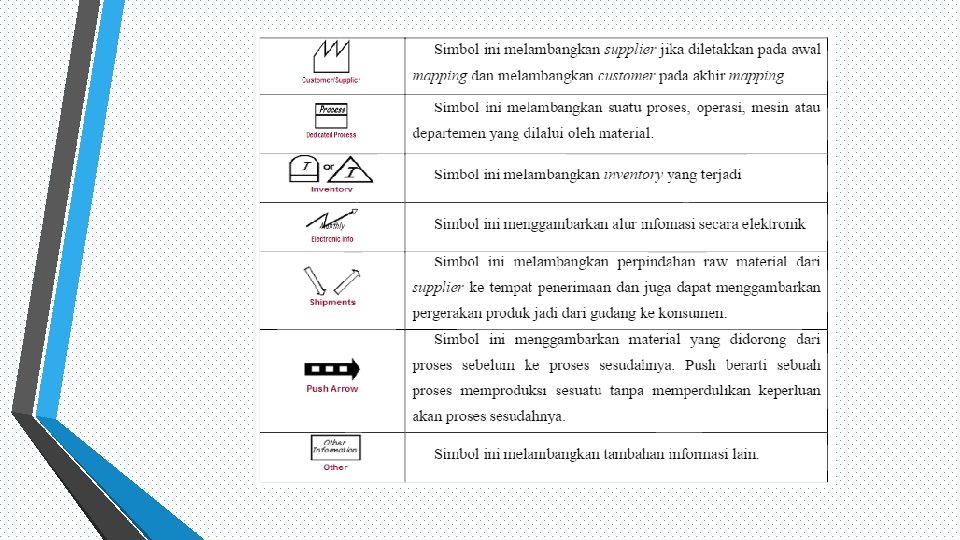 • • Menggambar icons yang merepresentasikan konsumen, supplier dan production control. • Masukkan data pengiriman dan penerimaan, gambarkan media pengiriman beserta dengan frekuensinya, gambarkan icon pengiriman dan arahnya dibawah media pengiriman. Terakhir gambarkan media pengiriman di bawah supplier beserta frekuensi dan arah. • • Gambarkan operasi yang berlangsung dari supplier sampai ke konsumen. • Gambarkan aliran push, pull atau gabungannya Menggambar kotak data dibawah icon konsumen dan masukkan kebutuhan konsumen didalamnya termasuk jumlahnya dalam hari dan bulan. Masukkan data proses seperti waktu siklus, uptime. Gambarkan aliran informasi baik secara elektronik dan manual. Gambarkan persediaan diantara proses termasuk barang dalam proses. Hitung waktu untuk persediaan tersebut.