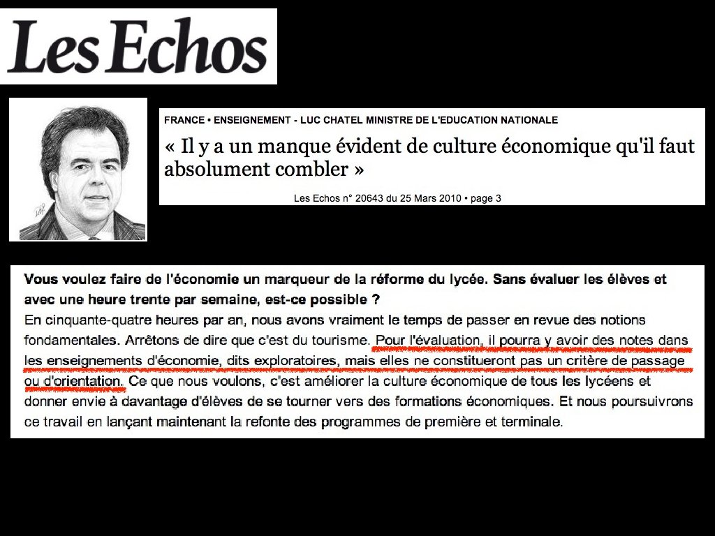 Chronologie • 16 décembre 2008 : 1ère réforme du Lycée (Darcos) annonce de l'entrée des SES dans le tronc commun • 17 décembre 2008 : Xavier Darcos, ministre de l'Éducation Nationale annonce que la réforme du lycée est "reportée". . . • septembre 2010 mise en place de la réforme du lycée par Luc Chatel : Les SES ne sont plus dans le tronc commun. . . • . . .