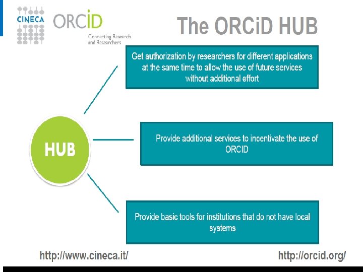 What has to be done v Currently almost 80 institutions are members of the Cineca – ORCID consortium v Increase awareness of the benefits of having an open, international persistent identifier among researchers (it is not another administrative burden) for visibility, career, evaluation etc. v Populate the profiles! Still too many are unpopulated v Cleaning of Research ID and Scopus ID v Make the institution understand the advantage and support it v Publishers more active role: should embed author’s ORCID in the metadata when the manuscript is accepted