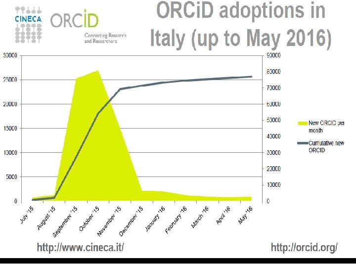 Adozione di ORCID in Italia (marzo 2018): le pubblicazioni e la loro visibilità Main sources Scopus - Elsevier 1. 160. 421 Researcher. ID 233. 483 European Pub. Med Central 1. 120. 69 Crossref 47. 370 NASA Astrophysics Data System 42. 467 www. cineca. it