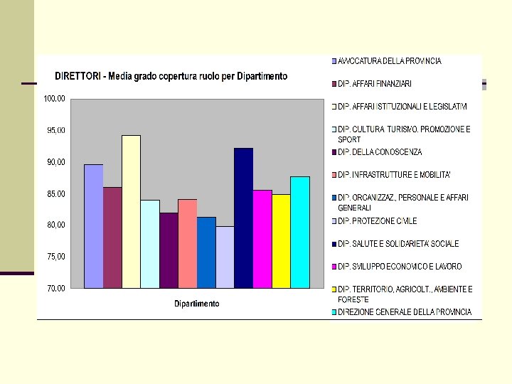 DIRETTORI media grado copertura ruolo Nr. Valu tati Min Max Media AVVOCATURA DELLA PROVINCIA 5 88, 00 90, 00 89, 60 DIP. AFFARI FINANZIARI 6 86, 00 DIP. AFFARI ISTITUZIONALI E LEGISLATIVI 8 82, 00 100, 00 94, 25 DIP. CULTURA, TURISMO, PROMOZIONE E SPORT 15 78, 00 94, 00 84, 00 DIP. DELLA CONOSCENZA 11 80, 00 86, 00 82, 00 DIP. INFRASTRUTTURE E MOBILITA' 19 80, 00 100, 00 84, 10 DIP. ORGANIZZAZ. , PERSONALE E AFFARI GENERALI 34 72, 00 100, 00 81, 23 DIP. PROTEZIONE CIVILE 9 76, 00 82, 00 79, 77 DIP. SALUTE E SOLIDARIETA' SOCIALE 7 80, 00 100, 00 92, 28 DIP. SVILUPPO ECONOMICO E LAVORO 22 72, 00 96, 00 85, 63 DIP. TERRITORIO, AGRICOLT. , AMBIENTE E FORESTE 44 68, 00 96, 00 84, 79 DIREZIONE GENERALE DELLA PROVINCIA 16 68, 00 100, 00 87, 62 Dipartimento