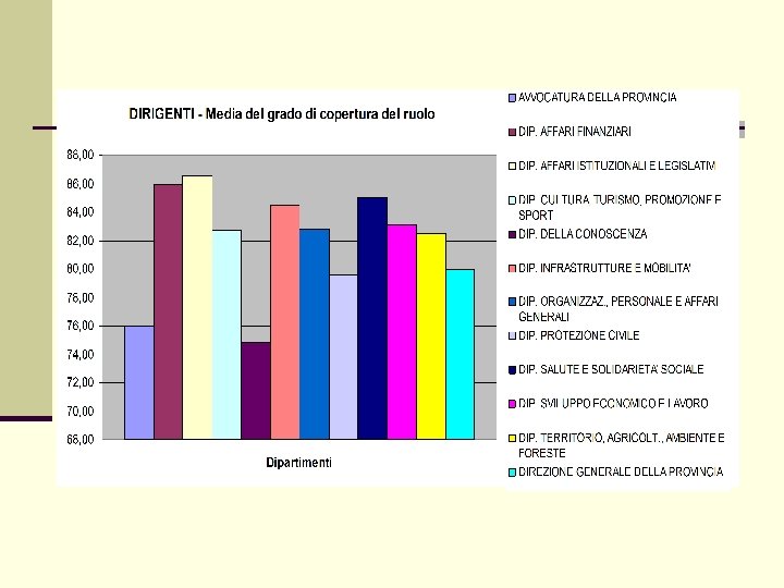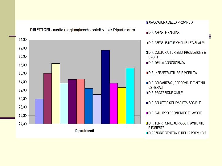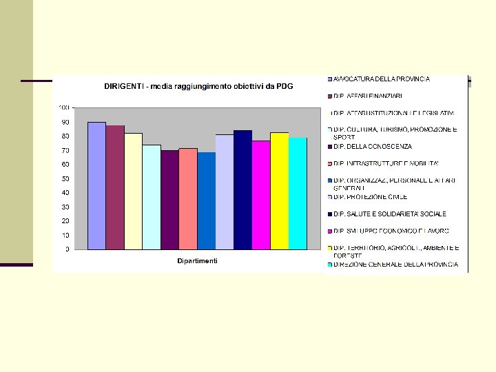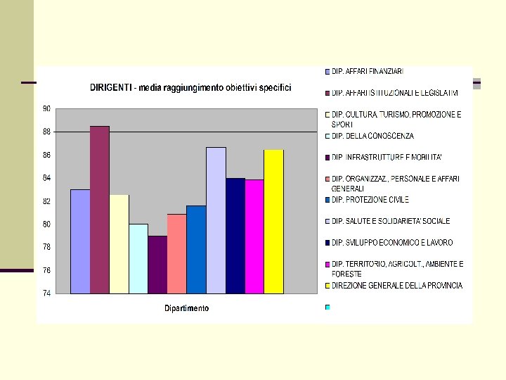 DIRIGENTI media raggiungimento obiettivi da Pd. G Dipartimento Nr. valutati Min Max Media AVVOCATURA DELLA PROVINCIA 1 90 90 90 DIP. AFFARI FINANZIARI 4 86 90 87, 5 DIP. AFFARI ISTITUZIONALI E LEGISLATIVI 8 80 86 82, 17 DIP. CULTURA, TURISMO, PROMOZIONE E SPORT 8 80 87 73, 75 DIP. DELLA CONOSCENZA 7 70 90 69, 86 DIP. INFRASTRUTTURE E MOBILITA' 12 45 86 71, 17 DIP. ORGANIZZAZ. , PERSONALE E AFFARI GENERALI 7 76 85 68, 86 DIP. PROTEZIONE CIVILE 5 80 85 81 DIP. SALUTE E SOLIDARIETA' SOCIALE 5 80 88 84 DIP. SVILUPPO ECONOMICO E LAVORO 9 83 90 76, 67 DIP. TERRITORIO, AGRICOLT. , AMBIENTE E FORESTE 20 80 90 82, 56 DIREZIONE GENERALE DELLA PROVINCIA 11 80 96 78, 8