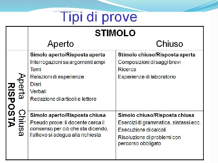 Tipologia di prove: � Per ogni funzione e/o obiettivo specifico della valutazione va impiegato uno strumento di verifica omologo e congruente con quella funzione e/o con quell’obiettivo (Domenici, 1991) � Le prove di verifica si classificano anche in base alla relazione tra tipologia degli stimoli e tipologia della risposta. � Stimolo aperto risposta aperta � Stimolo aperto risposta chiusa � Stimolo chiuso risposta aperta � Stimolo chiuso risposta chiusa