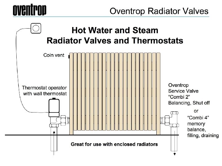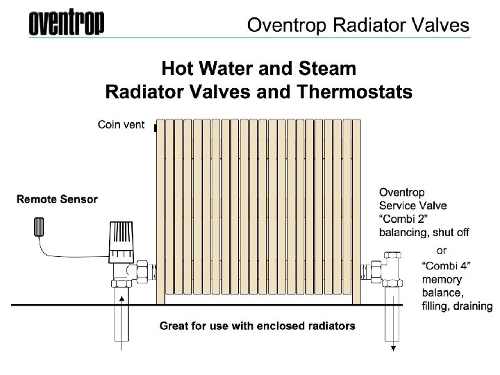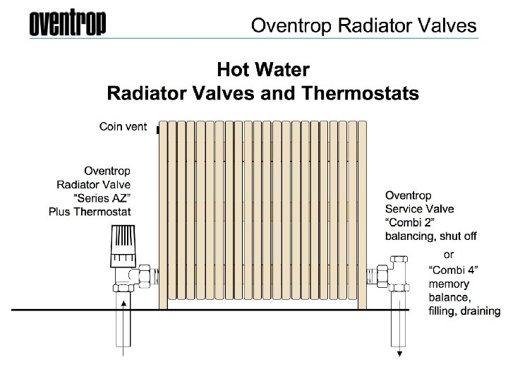 Liquid filled diaphram • hand calibrated Oventrop Radiator Valves and Thermostatic Operators Expand- Close Contract- Open Thermostat Radiator Valve Connection connection M 30 x 1. 5 Closed- no flow Open- modulating flow