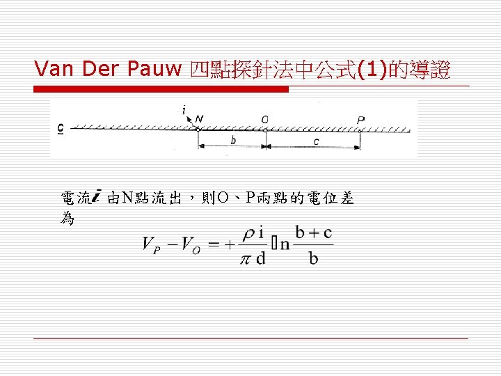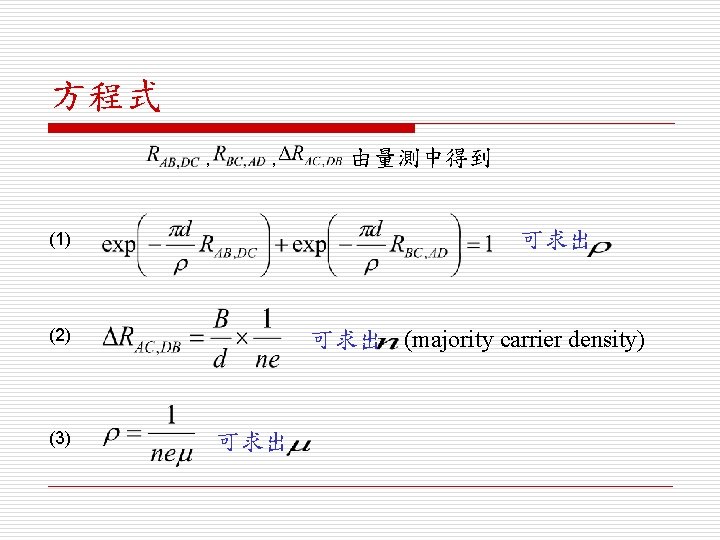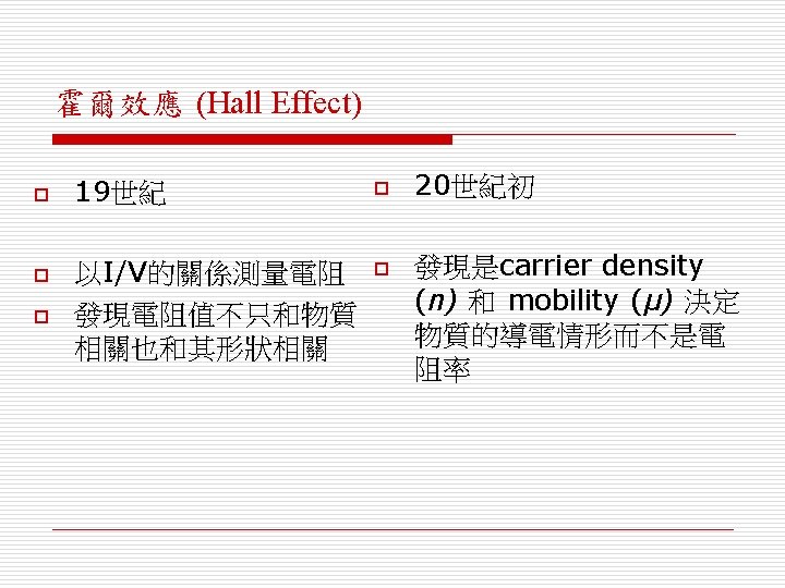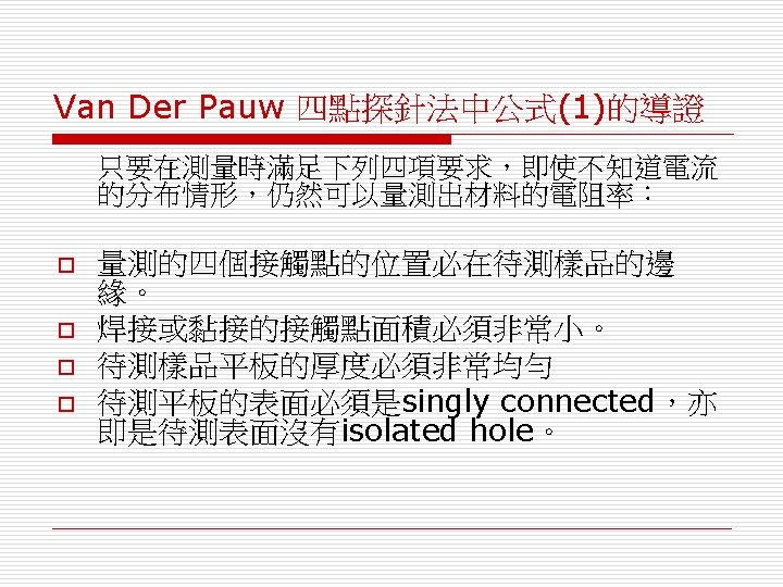 實驗目的 o 利用 Van Der Pauw 四點探針法和霍爾效應 (Hall effect),量測半導體中多數載子濃度與 遷移率μ (mobility) 。 The Van Der Pauw Method Original paper by L. J. van der Pauw in 1958 http: //electron. mit. edu/~gsteele/vanderpauw. pdf