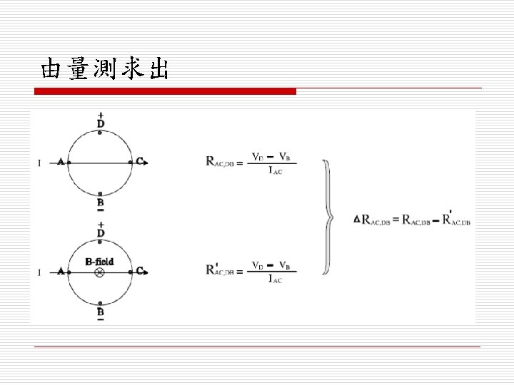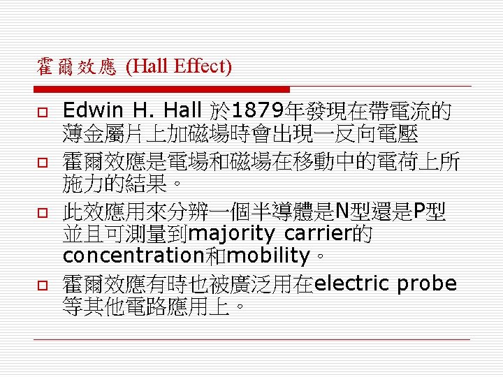 霍爾效應 (Hall Effect) 由Lorentz force balance: 得到 (positive for ptype) 又 其中 故 稱 Hall coefficient (positive for ptype) (d為導體厚度) : Hall voltage : Hall field : Hall coefficient