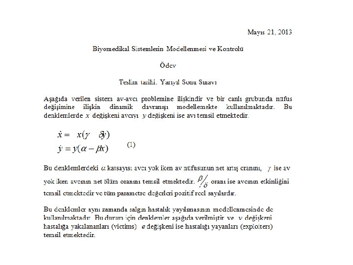 Bir örnek: iki av bir avcı sistemi İki av ve bir avcıdan oluşan bir sistemi ele alacağız. Bu sistemde avının nüfusu avcı olmadığında lojistik düzende artmakta. Avcı, av olmadığında ölmekte ve avının nüfusuda avcı olmadığında üstel olarak artmaktadır. Bu üç canlı grubunun bir arada denge durumunda varlığını sürdürmesinin mümkün olup olmadığını Routh-Hurwitz’den yararlanarak belirleyiniz. z’yi yemekten dolayı nüfusun artışı y’yi yemekten dolayı nüfusun artışı Ölümlülük avcı av Avcının ölümlülüğü Avcı yok iken nüfusun artışı av Avcının ölümlülüğü Lojistik artış Leah Edellstein-Keshet, «Mathematical Models in Biology» , Birkhauser Mathematics Series, 1988