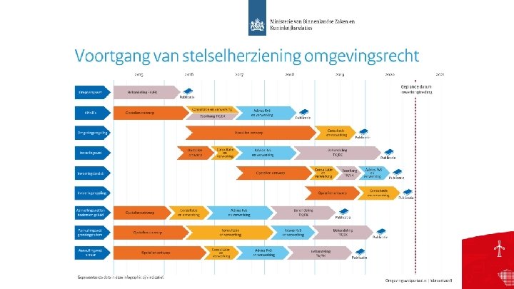 Opzet TRAINING ‘SAMENWERKEN MET DE OMGEVINGSWET’ Interbestuurlijke training: • 8 uur zelfstudie via online leeromgeving • 2 dagen training op een locatie in de regio Trainers: • 35 trainers: 19 inhoudelijke trainers en 16 veranderkundigen • zijn opgeleid: Omgevingswet, trainingsvaardigheden, transitiemanagement • geven training in duo’s Trainers geven trainingen aan cursisten • 45 uitvoeringen in periode maart – december 2018 • ca. 20 cursisten per training, ca. 1000 cursisten Continue verbeteren training door evaluatie door trainers en cursisten • Waardering door cursisten: 7 • Deelnemers zeggen klaar te zijn voor de Omgevingswet, maar… • Missen de juiste cultuur in de eigen organisatie • Willen meer kennis en vaardigheden om het werk goed te kunnen doen