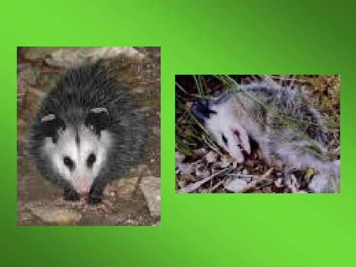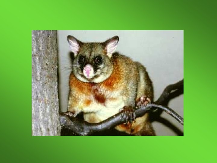 Vačice opossum • V Mexiko až S Argentina - listnaté lesy • nejznámější, nejhojnější a největší vačice (dorůstá do velikosti kočky) • v korunách stromů, po zemi se pohybuje těžkopádně • ožívá s příchodem soumraku (jinak spí v dutinách stromů, skalních puklinách, norách) • nenáročná na potravu - ještěrky, malí hlodavci, ptáci, hmyz, červi, zdechliny, popřípadě vegetariánství • dokáže se mistrně přetvařovat - nebezpečí -> dělá mrtvou, vyplázne jazyk, sotva znatelně dýchá, vylučuje pach zdechliny - může tak ležet až 6 hodin • ze savců nejkratší doba březosti - 12, 5 dne • mláďata váží málo přes 0, 1 g -> na čajovou lžičku jich vleze 20! • poblíž sídel pronásledována - škody na domácí drůbeži, srst