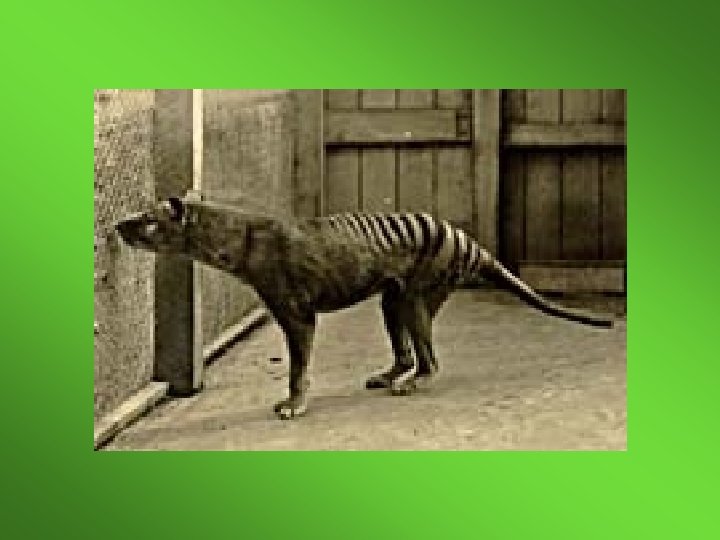 Vakovlkovití - vakovlk • • • původní výskyt - Tasmánie, Austrálie, Nová Guinea prokazatelně poslední jedinec uhynul zoo na Tasmánii roku 1936 spolehlivý důkaz o jeho stále existenci nebyl podán v 60. letech po něm pátral E. Hillary před 3 - 5 tisíci lety osídlil s pomocí člověka Austrálii i Novou Guineu pes dingo, který ho odsud vytlačil na Tasmánii dingo nepronikl, ale vybili ho farmáři roku 1938 vyhlásila vláda jeho úplnou ochranu, ale to už nebylo koho chránit připomínal psa, dokázal otevřít tlamu až 170 o obýval travnaté pláně, řídké lesy, do hlubokých lesů zatlačen lovil v noci - klokany, bandikuty, pozemní ptáky, ještěry neběhal rychle ani vytrvale, moment překvapení v zajetí se nikdy nerozmnožil, vycpanina v Národním muzeu v Praze