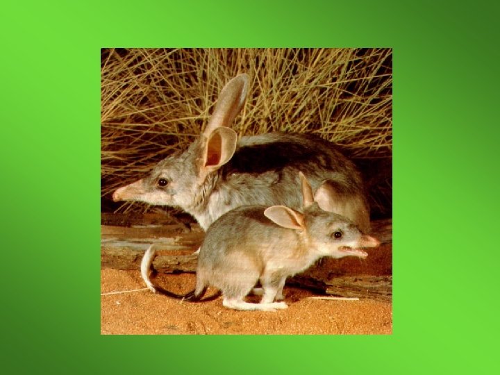 Bandikut králikovitý • SZ Austrálie • považován za jednoho z nejhezčích savců Austrálie • dlouhý tenký jazyk, velké boltce, hustě osrstěná zadní chodidla -> pouště, vyprahlé pustiny • nory spirálovitě stočené do hloubky 2 m - na území o rozloze 14 ha jich má několik • larvy hmyzu, hlízy, semena, plody, houby • spí vsedě, čumáček položí mezi přední tlapky a ušima si přikryje oči • dříve loven pro kožešinu, údajně i pro dobré maso • dnes přísně chráněný druh