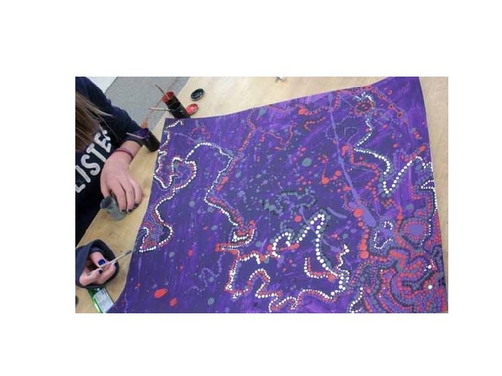 Process • Students will paint background on heavy paper or canvas paper. May be solid or patterned. • While paint is drying- students will sand their tools. – Students need to sand the ends. Get various diameters of wooden dowels –cut to 3 inch (2. 5 cm) lengths- and have them sand them. If you use Q Tips- cut off the cotton. (Keep reusing the Q Tip- as the extra paint “build up” on the end adds dimension to the dotting) • Take a large card box and place painted paper inside. Mix paint to heavy cream consistency and with a water color brush (it holds more paint) splatter paint on background. Carefully remove. • Mix colors and put into little containers. Start dotting creating form and lines. The painting is made up of little dots with large dots only for accents. • Dots must be tight and close together to create form and lines. • Color scheme and values add expressive lines and emphasis.