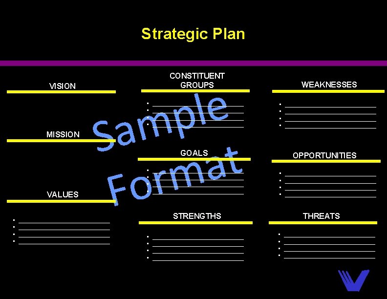 Overview of The Strategic Planning Process 1: Where Do We Want To Go? Vision Mission Constituent Groups Values Goals Objectives (Short & Long. Term) Long. Term View 2: Where Are We Now? Assumptions Strengths Weaknesses Opportunities Threats Situation Analysis 3: What Must We Do To Close The Gap? Critical Issues Key Decisions and Strategies Action Plans Strategy