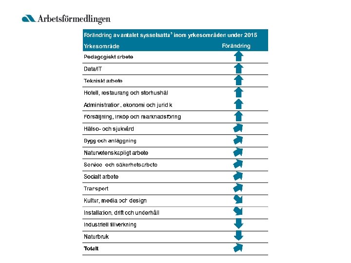 Var finns jobben? • Sysselsättningen stiger med 50 000 • Mycket bred jobbtillväxt för tjänsteyrken – Fler jobb hos både privata och offentliga arbetsgivare – Fler jobb på både gymnasial och eftergymnasial nivå • Färre jobb inom industriell tillverkning • Många möjligheter att etablera sig på arbetsmarknaden