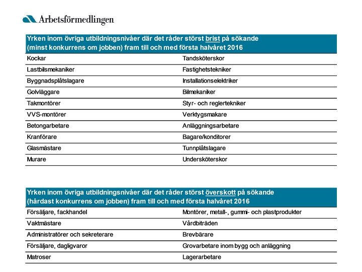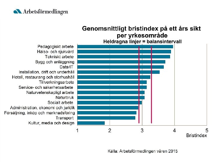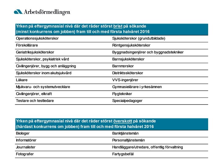 Var finns jobben? • För yrken på eftergymnasial nivå beror bristen på arbetskraft på: – Bristande intresse hos unga – Dimensioneringen av vissa utbildningar • För stort intresse för vissa eftergymnasiala utbildningar • På gymnasial nivå avser bristproblemen enbart yrkesinriktade utbildningar – Bristande intresse hos unga