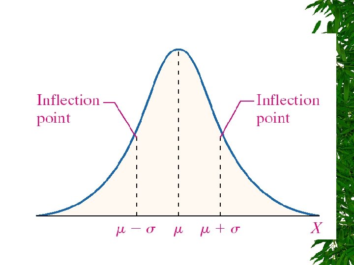 CIRI KURVA NORMAL Letak rata-rata, median, modus di x = . Kurva simetris terhadap sumbu vertikal yang melalui rata-rata . Kurva bertitik belok di x = , cekung ke bawah untuk - < X < + dan cekung ke atas pada bagian lainnya. Sumbu horizontal merupakan garis asimtot yang dihampiri kurva menuju kedua arah yang menjauh dari rata-rata. Luas daerah di bawah kurva dan di atas sumbu vertikal adalah 1.