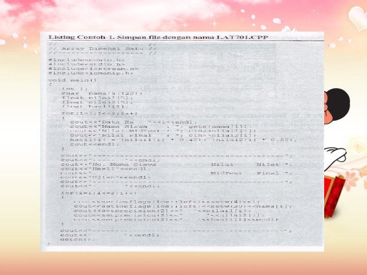 Contoh Float nilai [5] = {56. 6, 66. 7, 87. 45, 98. 5, 78. 9 };