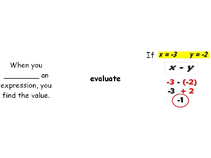 Evaluating Variable Expressions with Negative Variables 1) –x –(– 3) +3 3 2) 1. Substitute – 3 for x only. 2. Leave the negative (–) in front of the x alone. 3. Now, simplify the signs (kill the sleeping man) –y –(– 2) +2 2 3) Evaluate each expression using: x = – 3 y = – 2 z=6 1. Substitute – 2 for y only. 2. Leave the negative (–) in front of the y alone. 3. Now, simplify the signs. –z – 6 1. Substitute 6 for z only. 2. Leave the negative (–) in front of the z alone. 3. Now, simplify the signs.