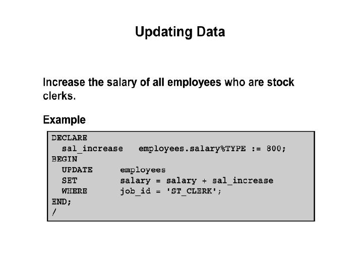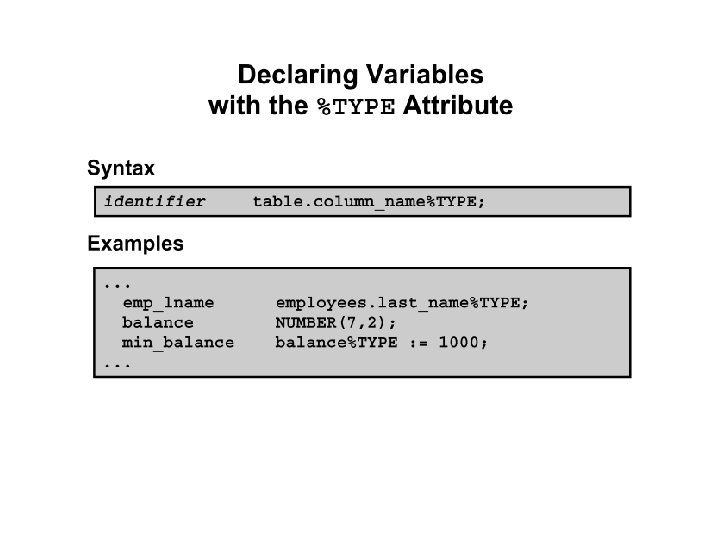 %TYPE Attribute • The %TYPE attribute Is used to declare a variable according to: – A database column definition – Another declared variable • Is prefixed with: – The database table and column – The name of the declared variable