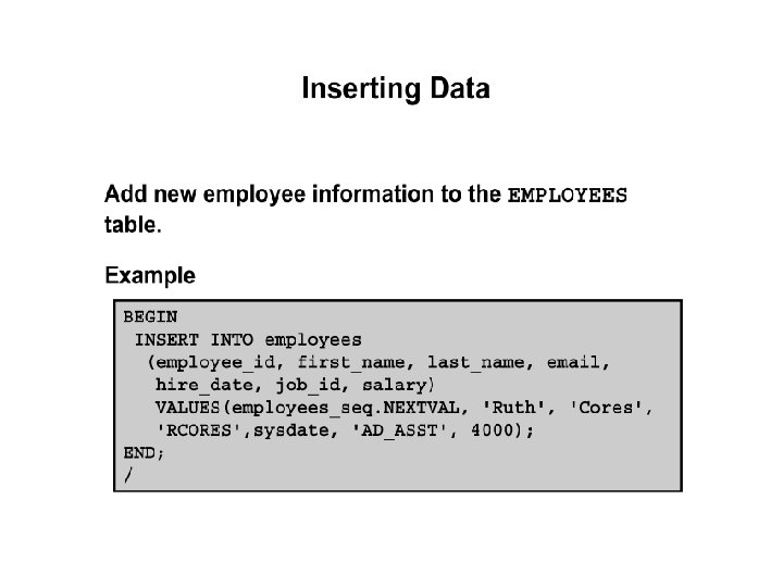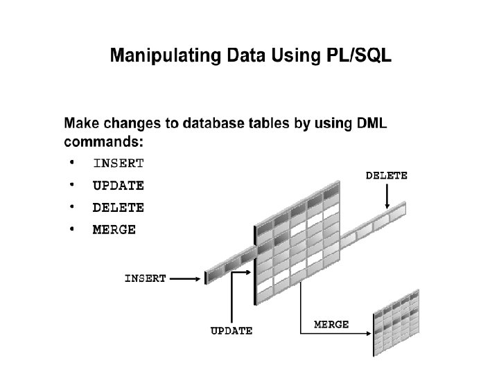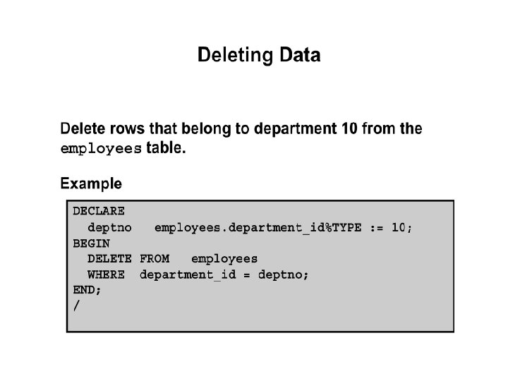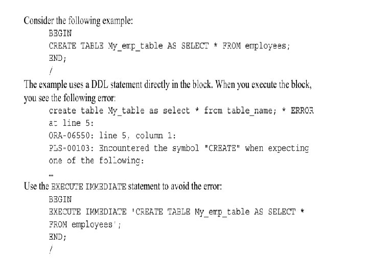 SQL Statements in PL/SQL • PL/SQL does not directly support data definition language (DDL) statements, such as CREATE TABLE , ALTER TABLE , or DROP TABLE • Use the EXECUTE IMMEDIATE statement, which takes the SQL statement as an argument to execute your DDL statement.
