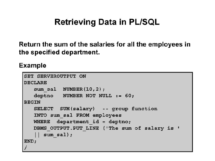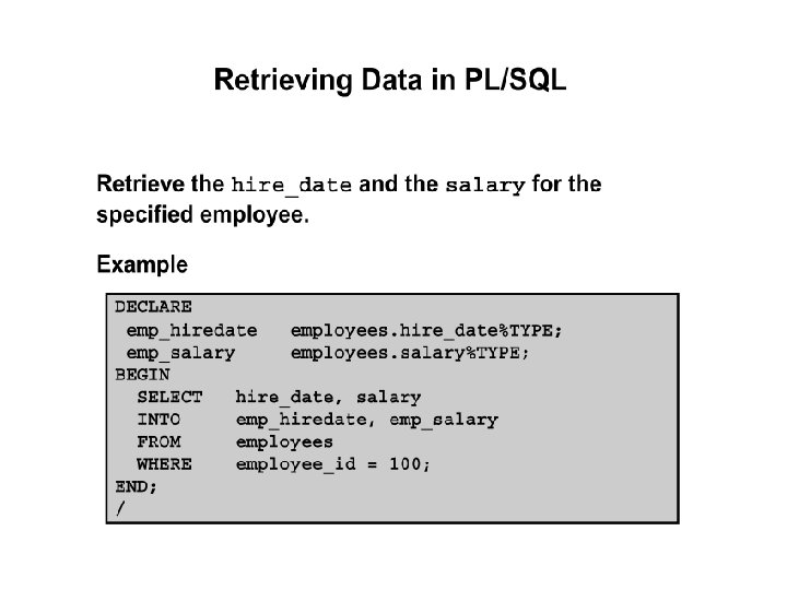 Guidelines for Retrieving Data in PL/SQL • Terminate each SQL statement with a semicolon ( ; ). • Every value retrieved must be stored in a variable using the INTO clause. • The WHERE clause is optional and can be used to specify input variables, constants, literals, and PL/SQL expressions. However, when you use the INTO clause, you should fetch only one row; using the WHERE clause is required in such cases. • Specify the same number of variables in the INTO clause as the number of database columns in the SELECT clause. Be sure that they correspond appositionally and that their data types are compatible.