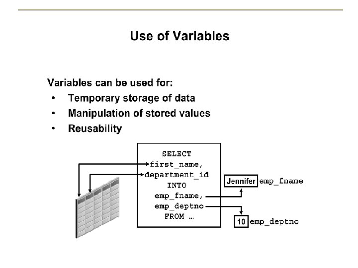 Use of Variables • Temporary storage: You can use the value stored in these variables for processing and manipulating the data • Variables are mainly used for storage of data and manipulation of stored values. Consider the SQL statement shown in the slide. The statement retrieves the first_name and department_id from the table. If you have to manipulate the first_name or the department_id , then you have to store the retrieved value. • Reusability is another advantage of declaring variables. After they are declared, variables can be used repeatedly in an application by referring to them in the statements.