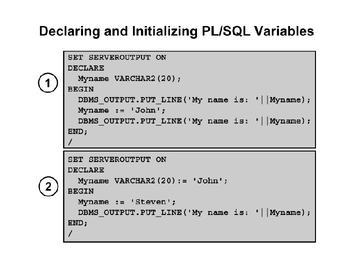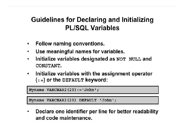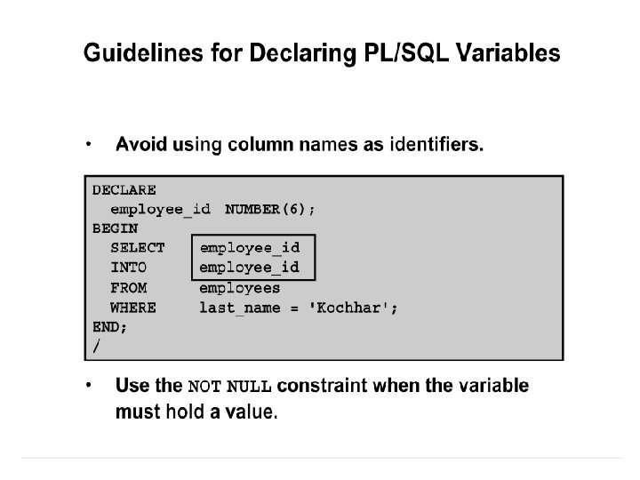 Guidelines for Declaring PL/SQL Variables • Impose the NOT NULL constraint when the variable must contain a value. You cannot assign nulls to a variable defined as NOT NULL. The NOT NULL constraint must be followed by an initialization clause. – pincode NUMBER(15) NOT NULL : = 'Oxford';