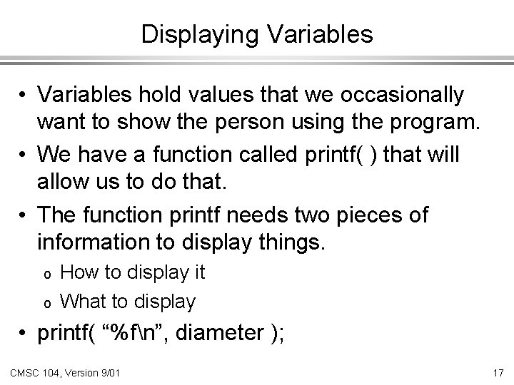 Displaying Variables • Variables hold values that we occasionally want to show the person using the program. • We have a function called printf( ) that will allow us to do that. • The function printf needs two pieces of information to display things. o o How to display it What to display • printf( “%fn”, diameter ); CMSC 104, Version 9/01 17