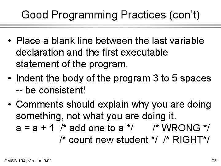 Good Programming Practices • Place each variable declaration on its own line with a descriptive comment. • Place a comment before each logical “chunk” of code describing what it does. • Do not place a comment on the same line as code (with the exception of variable declarations). • Use spaces around all arithmetic and assignment operators. • Use blank lines to enhance readability. CMSC 104, Version 9/01 27