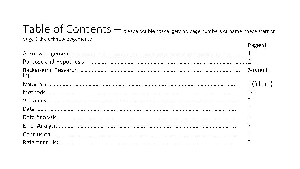 Data Analysis • Things to discuss and analyze – • Discuss what is on your graphs (rarely also tables) - however do NOT just repeat data point for point. Discuss averages and really significant points (and/or outliers and why they are significant or might have occurred). • Use table numbers and graph numbers in your discussion. • DEFINITELY talk about the Final avg data for each independent condition. • What implication the data has. • Range of data for each condition can be useful, if you use range talk about if the range is large or small and why that might be good or not good) • Trends • Patterns • Consistency (wide range within each condition is not good, why wide range? ) • Wide range between conditions is good/informative because it shows there is a change in data based on changes you made. • Compare averages/NUMBERS • A+ to compare % change between each conditions (use averages) • Differences between your AVERAGES especially • Explain graphs and some data in tables (outliers is something to think about)