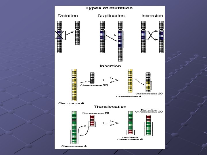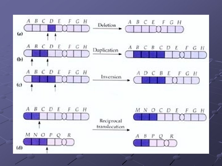 Alteraciones estructurales del cariotipo Reordenamiento de la disposición lineal de los genes en el cromosoma • Deficiencias y deleciones • Duplicaciones • Inversiones • Translocaciones