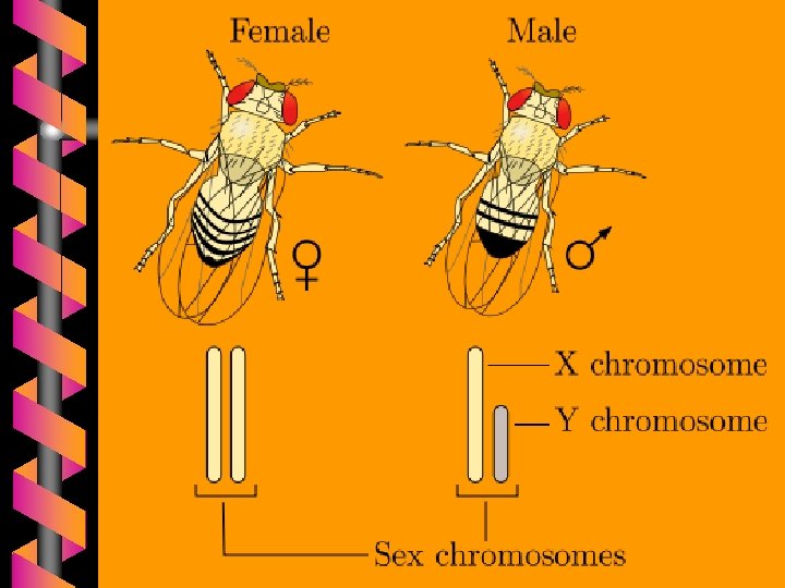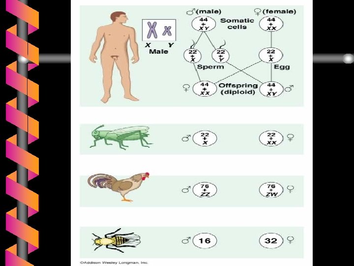 b Homogametic sex -- that sex containing two like sex chromosomes • In most animals species these are females (XX) • Butterflies and Birds, ZZ males b Heterogametic sex --- that sex containing two different sex chromosomes • • • In most animal species these are XY males Butterflies and birds, ZW females Grasshopers have XO males