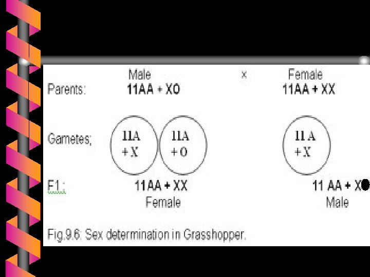 Determinasi sex 3. Metode XO Pada ordo Orthoptera (eg belalang), dan Heteroptera (eg Kepik) Pada belalang: betina : 11 ps otosom + XX semua sel telur berisi 11 + X Jantan : 11 ps otosom + X sperma berisi 11 + X atau 11 kromosom saja, tanpa X atau Y