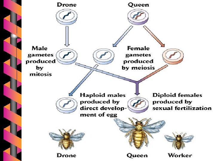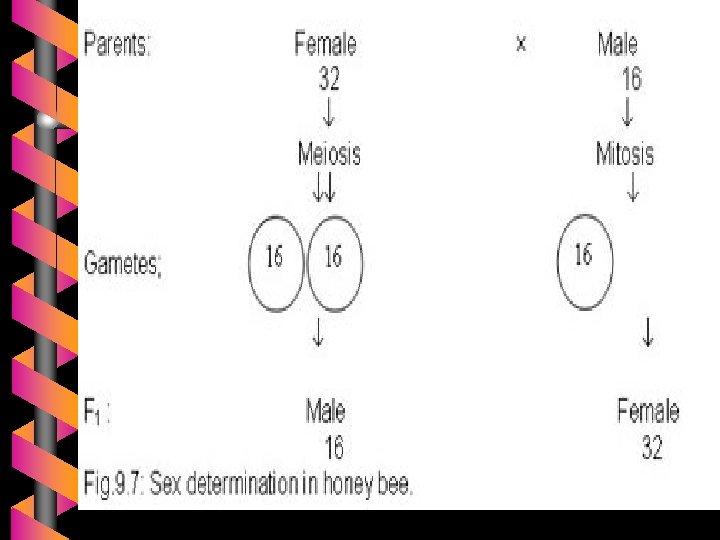 Determinasi sex 4. Metode lebah madu /diploid-haploid Pd lebah madu dan hymenoptera yang lain lebah jantan memiliki jumlah kromosom haploid lebah betina (pekerja) diploid lebah ratu yg mengatur betina (dibuahi sperma isi diploid), atau menjadi lebah jantan yag haploid melalui partenogenesis.