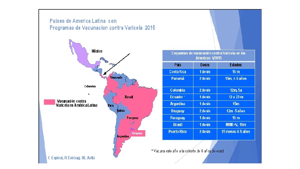 CARGA DE ENFERMEDAD EN LATINOAMERICA OMS estima que la carga de enfermedad por varicela en el mundo incluiría 4´ 200, 000 complicaciones /año con hospitalizaciones, y 4, 200 muertes asociadas. (1) • Poca información sobre la carga de enfermedad de varicela y herpes zoster en los países en desarrollo, así como de la incidencia y consecuencia de las infecciones secundarias. (2) • En Latinoamérica la incidencia total de casos es alta. Se estima más de 800, 000 casos/ año. El 87% menores de 10 años, (1 -5 años: 60%). • Letalidad: 1 de cada 100, 000 niños de 5 a 9 años y 20 de 100, 000 adultos afectados. • (1) http: //www. who. int/inmunization/SAGE/meetings/2014/april (2) Bardach A, et al. Incidence and use of resources for chickenpox and herpes zoster in Latin America and the Caribbean--a systematic infectious disease journal. 2012; 31(12): 1263 -8. review and meta-analysis. The Pediatric