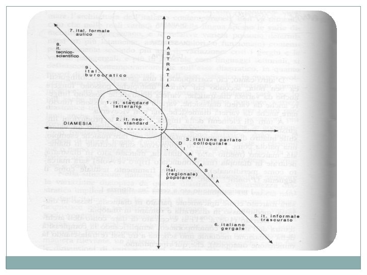 Repertorio linguistico italiano �SOTTOCODICI presentano una caratteristica particolare: ai dati di base del codice aggiungono dei dati particolari che si riferiscono ad un determinato settore di attività culturale / sociale / professionale; �REGISTRI sono varietà del codice che dipendono dalla situazione comunicativa, scegliendo tra le diverse possibilità offerte dal codice stesso.
