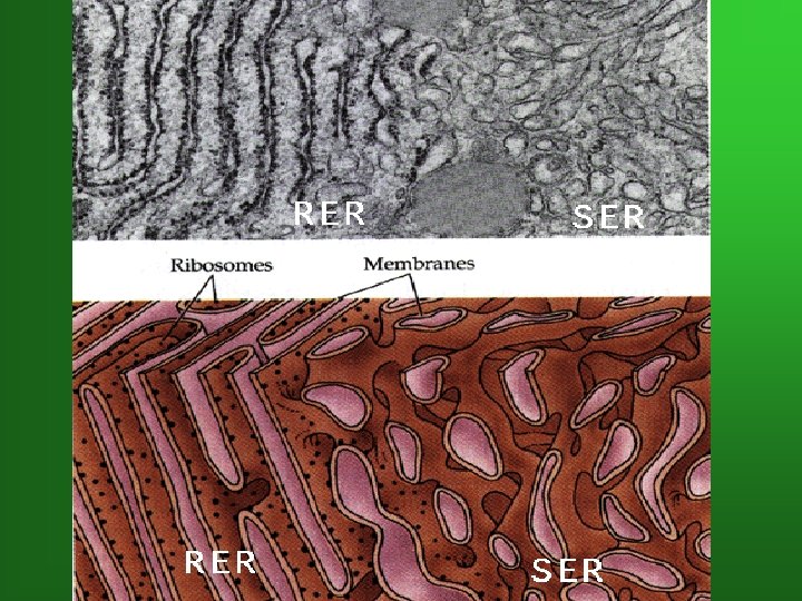 2. Réticulum endoplasmique (p. 42) • Description Ø Prolongement de la membrane nucléaire (simple membrane) Ø S’étend dans tout le cytoplasme (labyrinthe) Ø 2 types: a) Réticulum endoplasmique rugueux (granuleux) b) Réticulum endoplasmique lisse