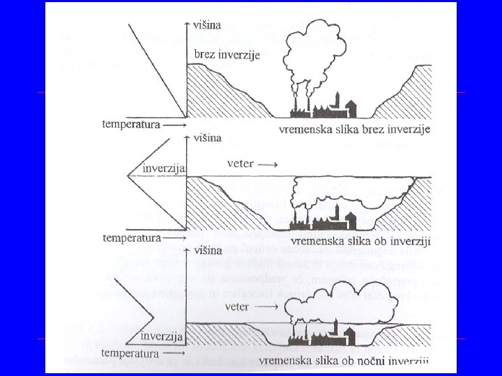 Inverzijska meja in transport škodljivih snovi v atmosferi • Navadno temperatura z višino pada • Včasih začne temperatura z višino rasti • Nastane temperaturna inverzija, ki jo pogosto spremlja megla • Ponoči je inverzijska plast nižja kot podnevi, nastaja pa zaradi izmenjave toplote med površino Zemlje in zrakom nad njo