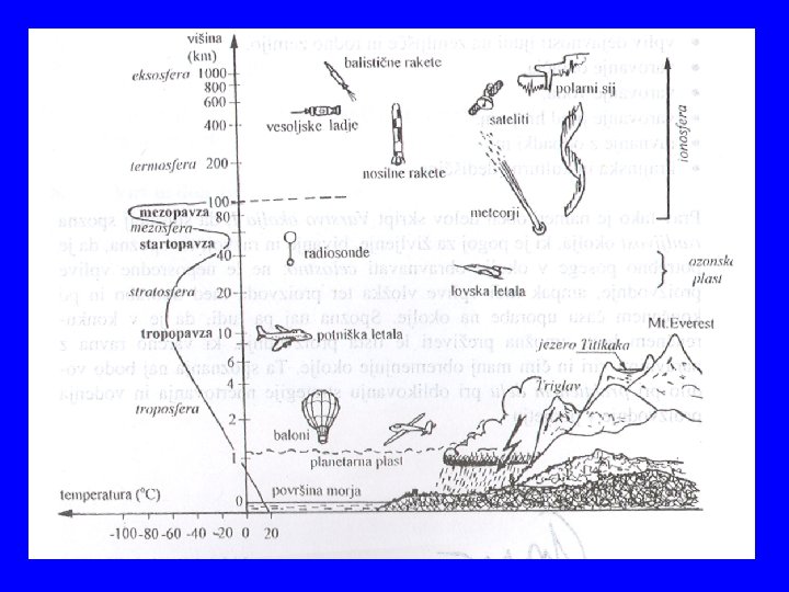 Značilnosti atmosfere • V troposferi je okrog 2/3 celotne mase ozračja in se dogajajo praktično vse vremenske spremembe • Planetarna plast poteka na meji oblakov