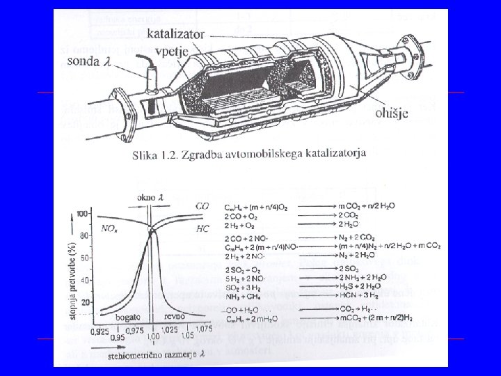 Avtomobilski katalizator • Katalizator zmanjša emisijo nevarnih snovi za 90 % za desetkrat • Delovati mora v ozkem področju razmerja med kisikom in gorivom “ozko okno “ • je molsko razmerje med zrakom in gorivom pri idealnem stehiometričnem razmerju je = 1