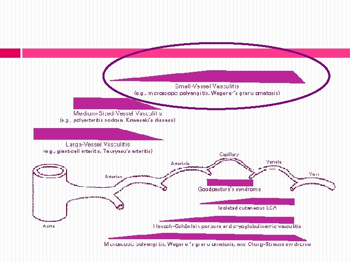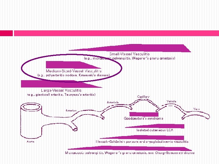 VASCULITIS- Concepto Grupo complejo de enfermedades afectan arterias, arteriolas, capilares, vénulas y venas Patogenia inmunológica necrosis fibrinoide e inflamación de paredes vasculares con obstrucción y/o aneurismas