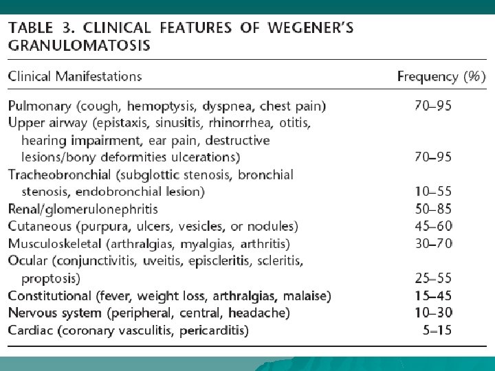 GRANULOMATOSIS WEGENER Epidemiología: En USA la prevalencia esta entre 13 – 30 casos por millón personas por un período de 5 años. u Es frecuente entre la 4 ta y 6 ta década de la vida. u Niños o adolescentes son raramente afectados u No hay una predominancia de género. u